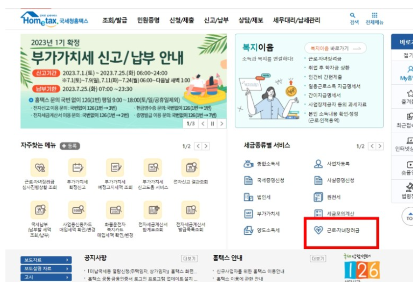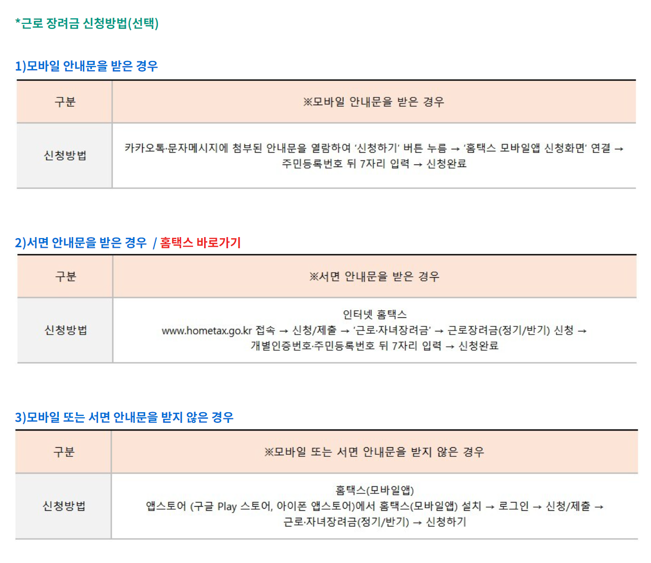 - 인터넷 홈텍스 : 인터넷홈택스 접속 → 신청/제출 메뉴 또는 보지이음 배너 `근로.자녀장려금` → 간편신청하기를 통해 개별인증번호 입력 → 주민등록번호 뒤 7자리 입력 → 신청완료