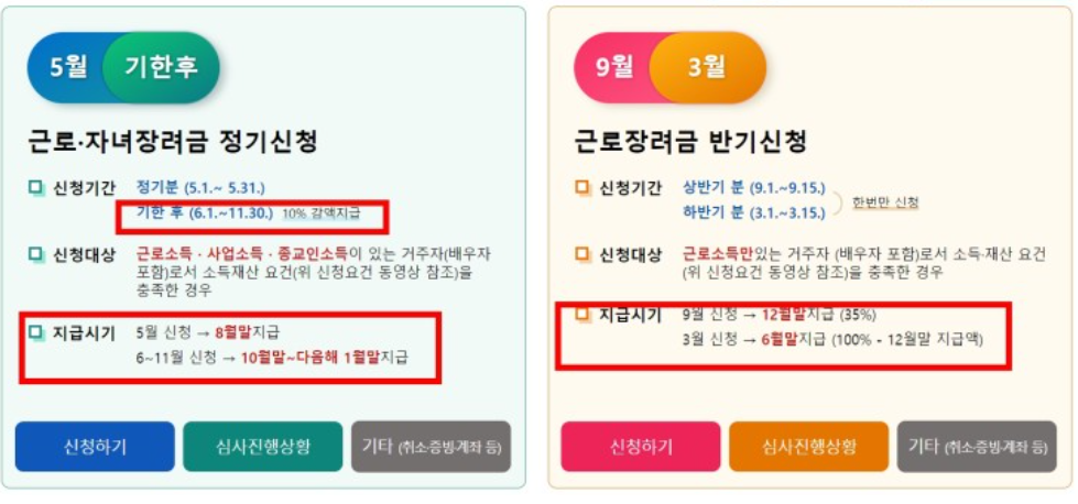 - 근로 자녀장려금 지급시기: 5월 신청 → 8월 말 지급, 6월부터 11월 신청 → 10월 말부터 다음 해 1월 말 지급