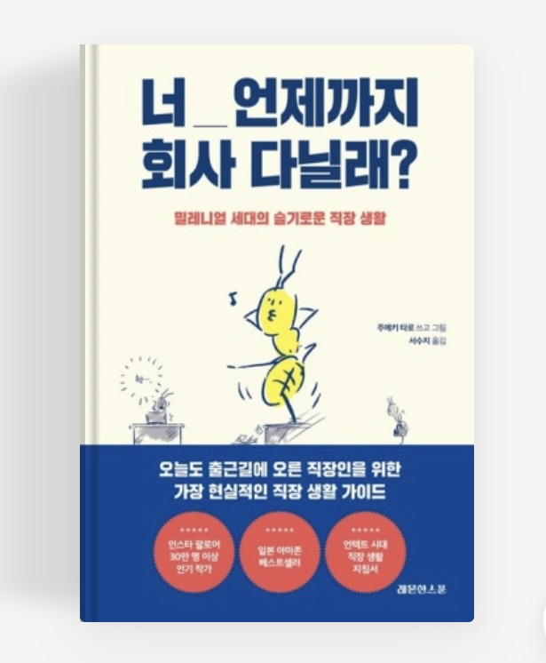 너 언제까지 회사 다닐래? 도서는 현재 세대에 슬기로운 직장 생활과 오늘도 출근길에 오른 직장인을 위한 가장 현실적인 직장 생활 가이드 도서입니다. 밀레니얼 시대에 출근하자마자 퇴사하고 싶은 이 새대의 일개미에게 바치는 리얼한 직장 생존기 줄거리이다 청년고용률 시대 높은 경쟁률을 뚫고 어렵게 입사를 했지만 얼마 되지 않아 퇴근 대신 퇴사를 꿈꾸는 이들이 많은 시대입니다. 무책임한 상사, 아부하는 동료, 뺀질대는 부하의 유형별 대처법을 통해 정신 건강과 우리의 연봉을 지켜라입니다.