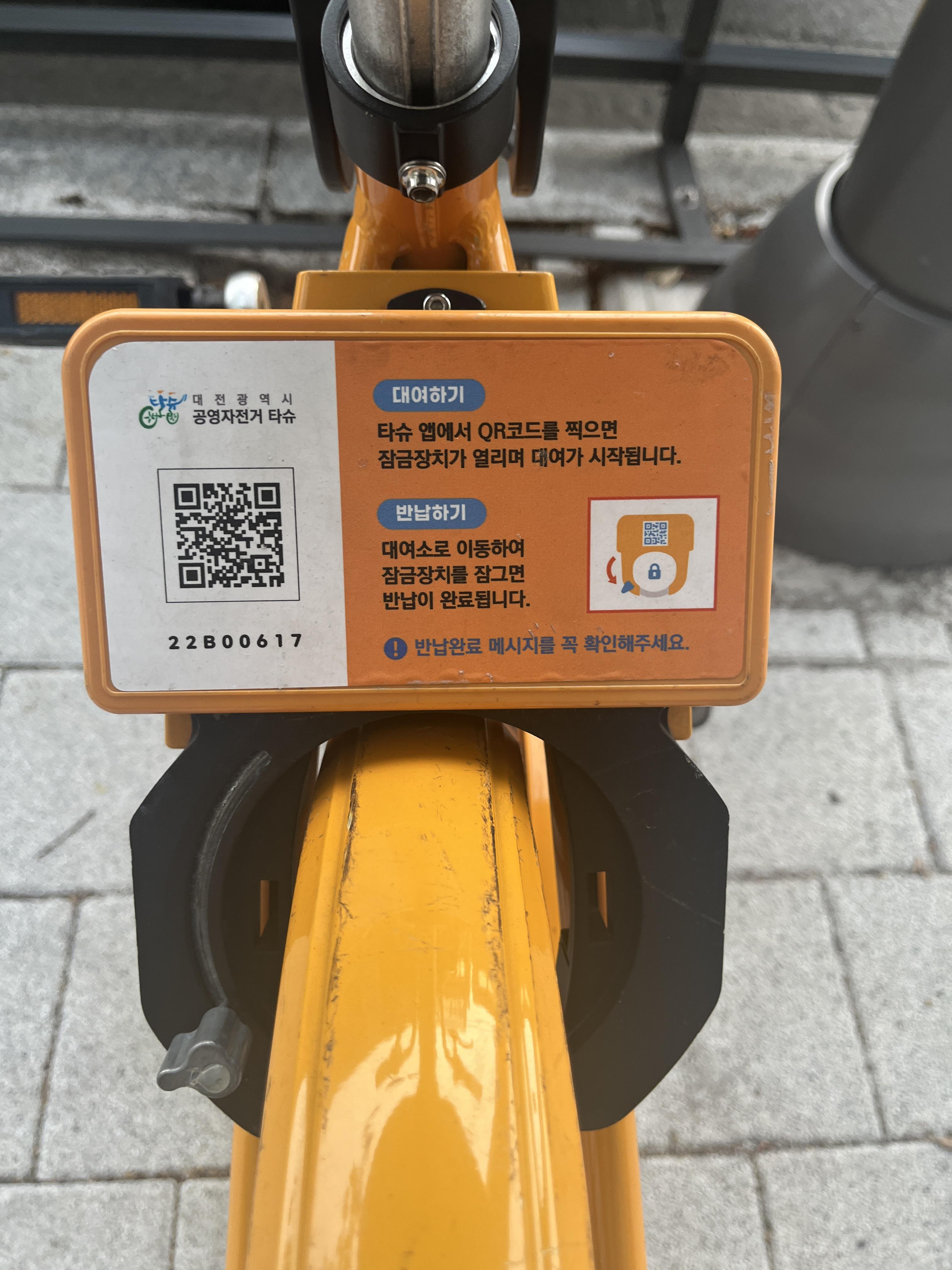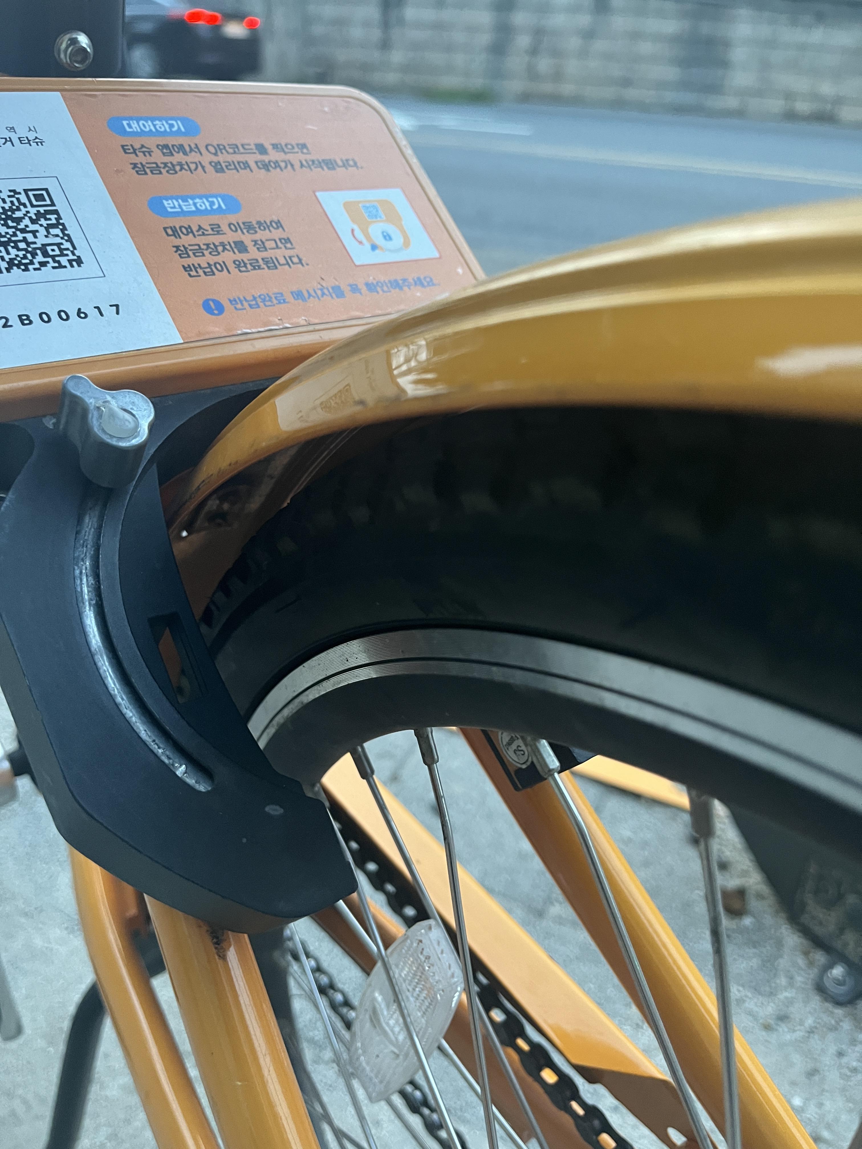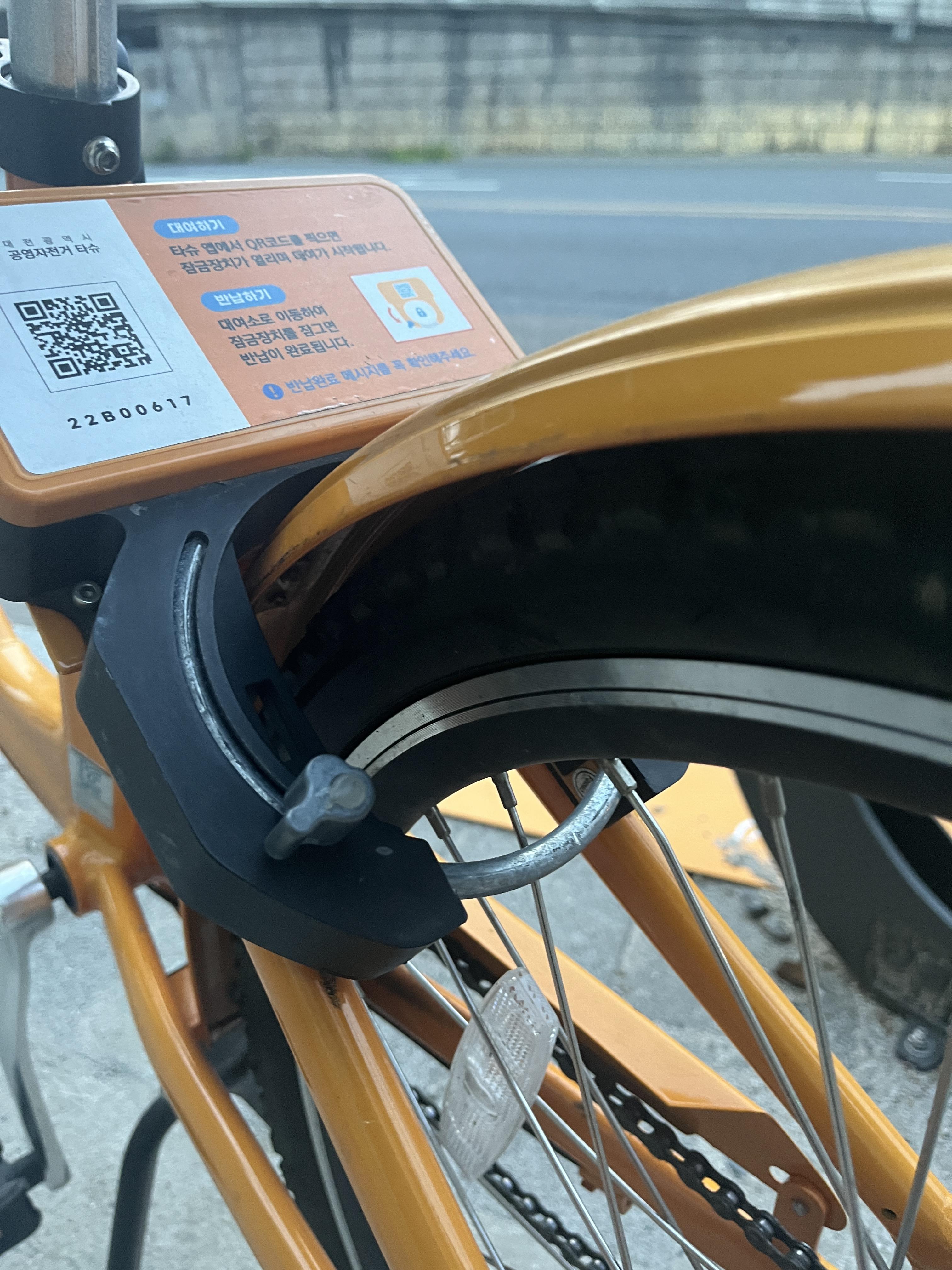 대여소에 자전거를 세우고 뒷바퀴에 있는 스마트락의 레버를 내려 잠근 후