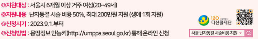 아이 키우기 좋은 도시를 만들기 위한 `엄마아빠 행복프로젝트`를 시작으로 저출생 극복에 총력을 쏟고 있는 서울시가 내달 9월 1일부터 `서울 난자동결 시술비용 지원`을 본격 시작합니다. 대상은 20세 ~ 49세 여성 선착순으로 300명으로 난자동결 시술비용을 최대 200만 원을 지원합니다.