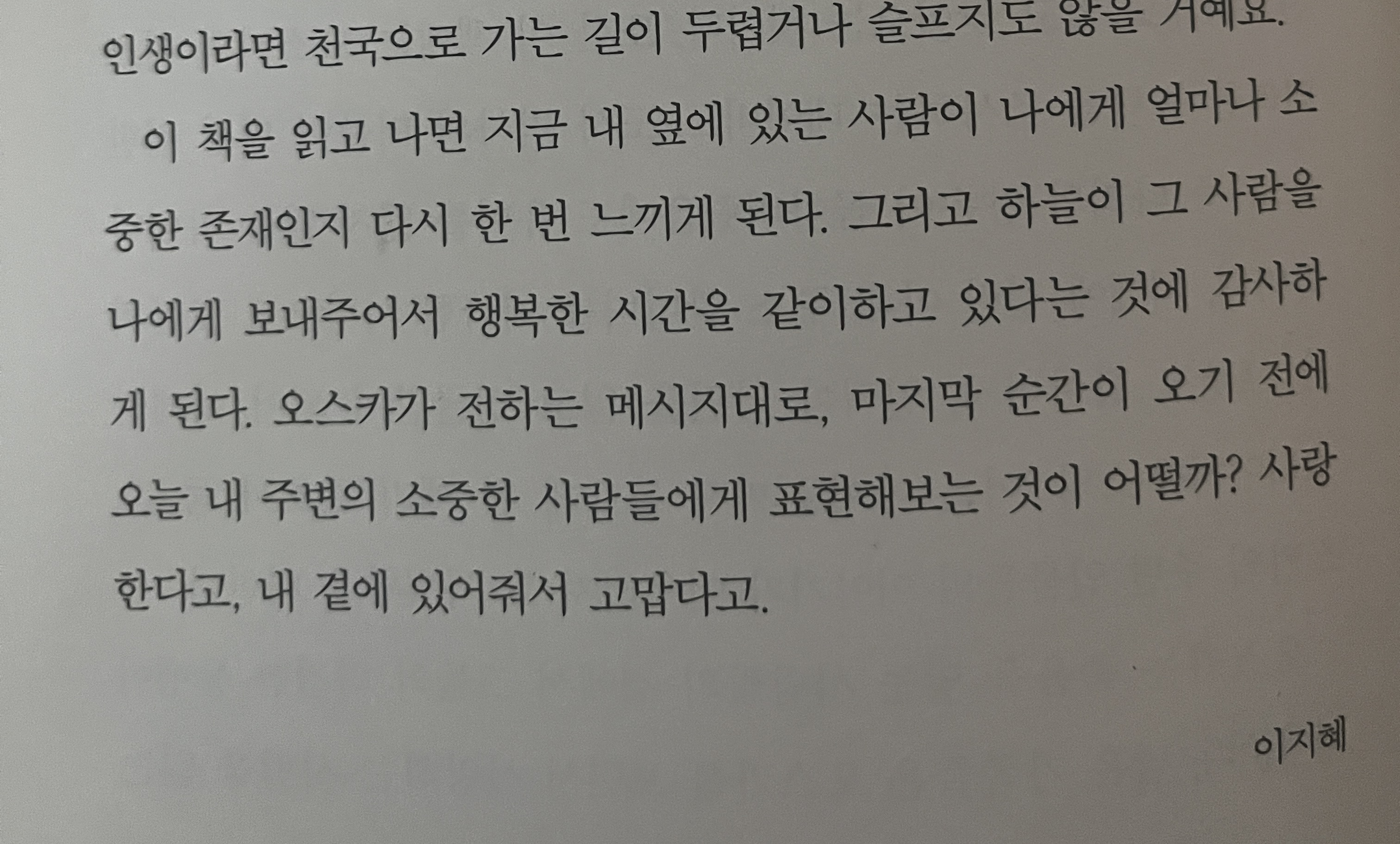 이 책을 읽고 나면 지금 내 옆에 있는 사람이 나에게 얼마나 소중한 존재인지 다시 한번 느끼게 된다.