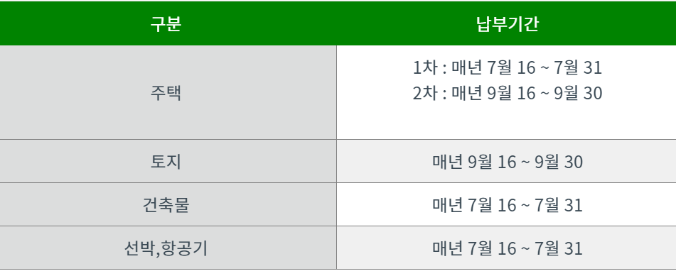 재산세는 매년 6월1일 기점으로 2번 (7월, 9월)에 걸쳐 나누어 발행됩니다.