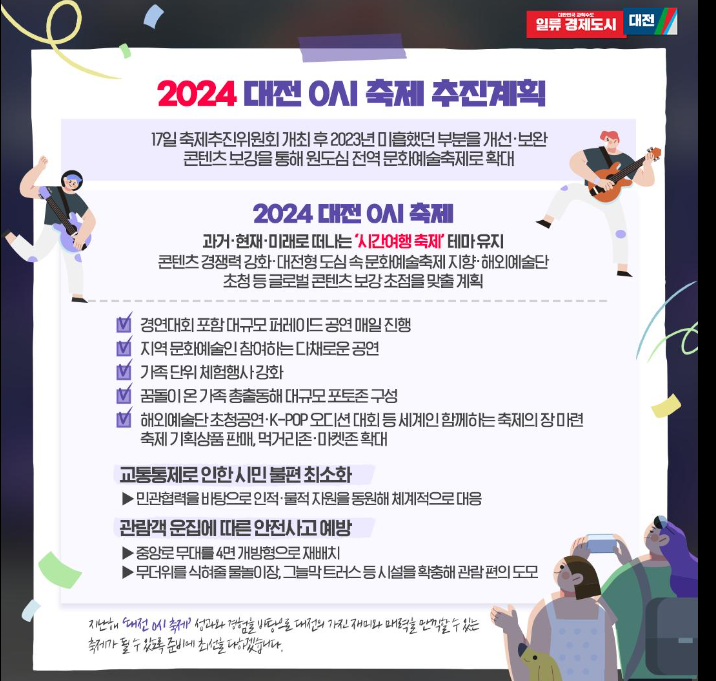 2024년대 전 0시 축제의 추진 계획이 나왔습니다. 미흡했던 2023년 0시 축제를 기본으로 미흡했던 부분을 개선. 보완하면서 콘텐츠를 강화하여 2024년 8월 9일 개막을 시작하여 9일간의 축제가 진행됩니다. 세계적인 축제로 비상하는 대전 0시 축제를 꼭 기대해 주세요.